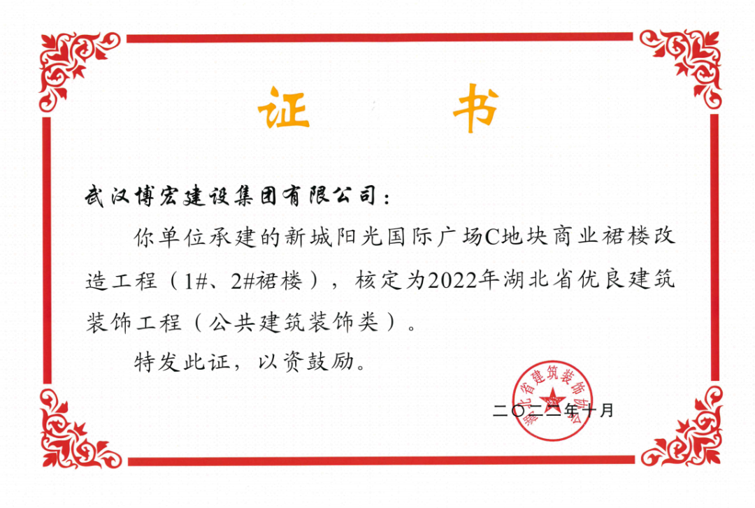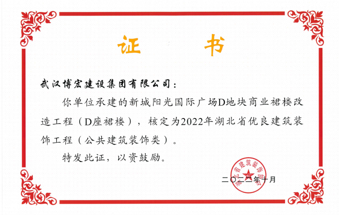近日,湖北省建筑裝飾協會發布了《關于開展2022年湖北省建筑裝飾工程質量目標考核工作的通知》,由博宏建設集團承建的華發四季等5所幼兒園裝修工程(EPC)、新城陽光國際廣場C地塊商業裙樓改造工程(1#、2#裙樓)、新城陽光國際廣場D地塊商業裙樓改造工程(D座裙樓)、武漢市漢陽區八所中小學新建PPP項目-永安堂小學被核定為“2022年湖北省優良建筑裝飾工程(公共建筑裝飾類)”。