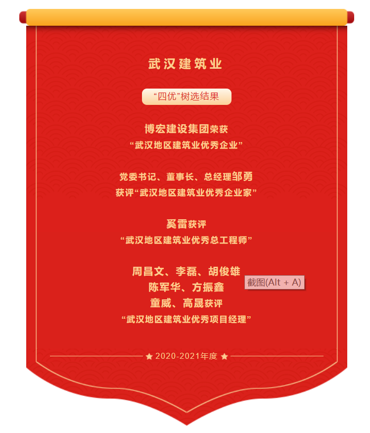? ? ? ? 近日,武漢建筑業協會發布2020-2021年度武漢地區建筑業優秀企業、優秀企業家、優秀總工程師、優秀項目經理(以下稱為“四優”)選樹結果。經會員單位自主申報、協會組織專家評審、主管部門復核、武漢建協三季度會長辦公會審議通過并在協會網站進行公示,“四優”選樹結果名單火熱出爐。博宏建設集團榮獲“武漢地區建筑業優秀企業”;黨委書記、董事長、總經理鄒勇獲評“武漢地區建筑業優秀企業家”;奚雷獲評“武漢地區建筑業優秀總工程師”;周昌文、李磊、胡俊雄、陳軍華、方振鑫、童威及高晟獲評“武漢地區建筑業優秀項目經理”。