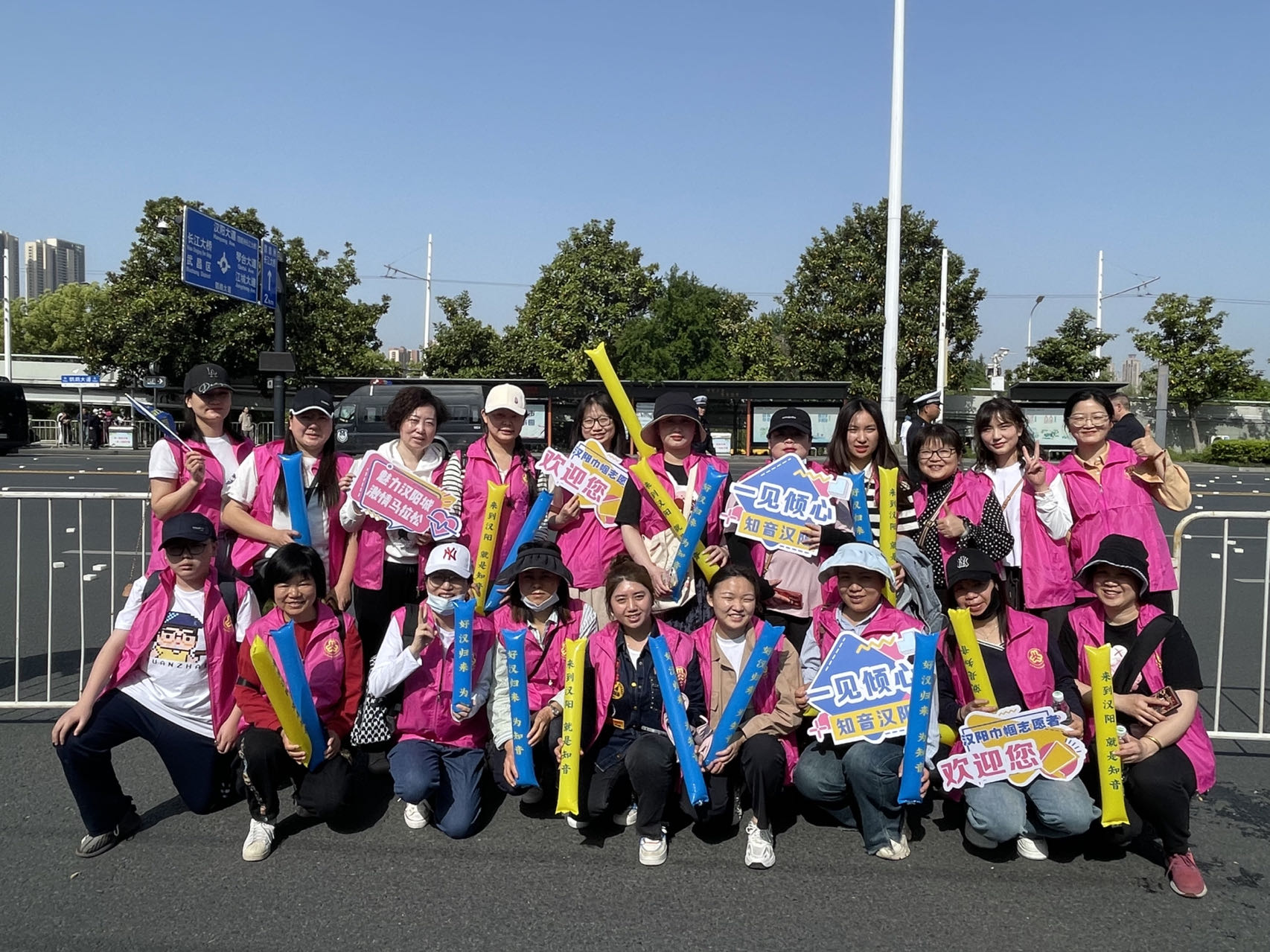 彭迎(第二排右一)參加武漢馬拉松志愿服務活動