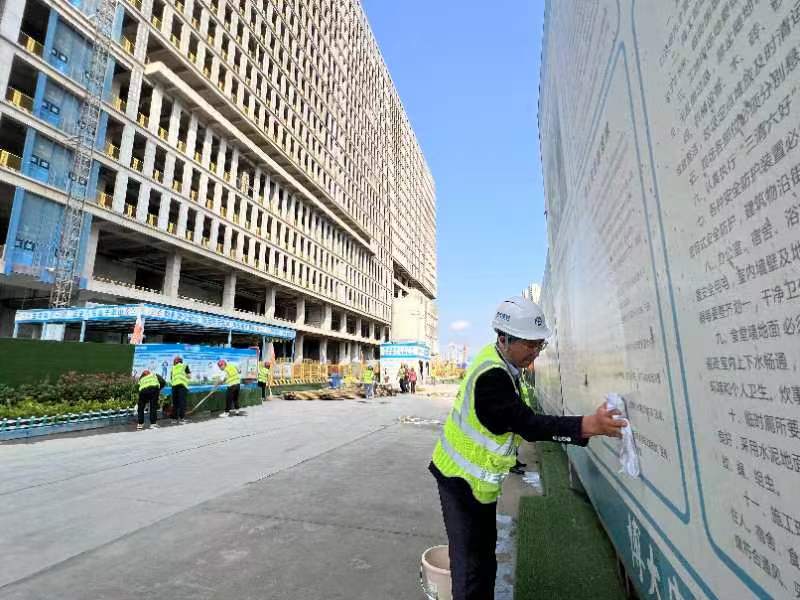 針對辦公區,作業區和生活區施工環境的薄弱環節,區建筑管理站工作人員與項目現場人員一起拿起掃帚、拖把、抹布等清潔工具,“擼起袖子”對綠化、圍擋、路面的環境衛生情況進行清潔整治,以查漏補缺的方式做好項目文明施工的細節,不留一處死角,杜絕“臟、亂、差”現象,實打實助力項目成為清潔工地。