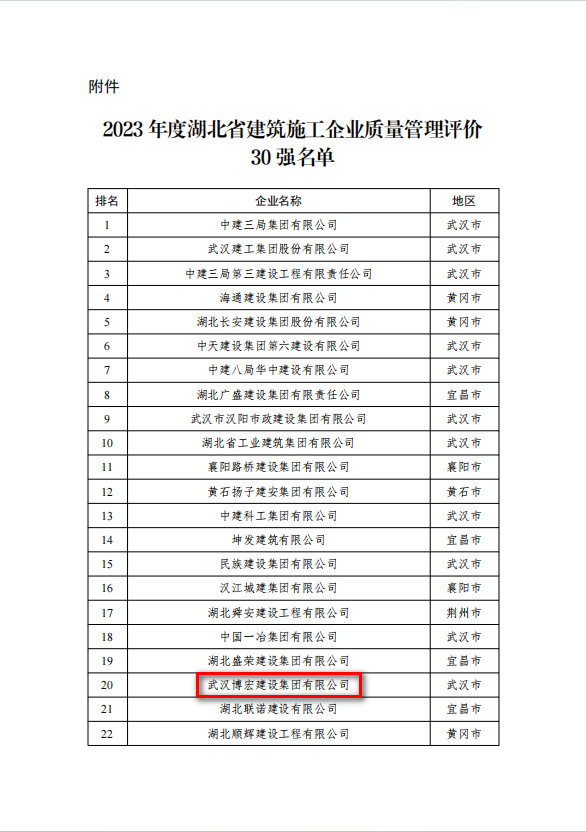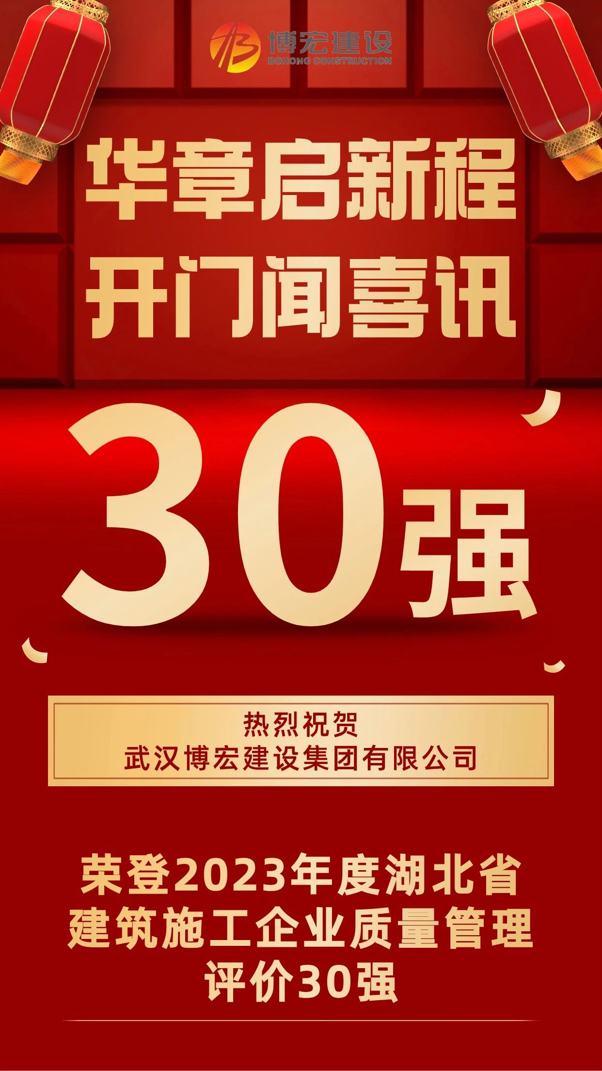 華章啟新程,開門聞喜訊。近日,湖北省建設(shè)工程質(zhì)量安全協(xié)會(huì)公布2023年度湖北省建筑施工企業(yè)質(zhì)量管理評價(jià)30強(qiáng)名單,博宏建設(shè)集團(tuán)榮耀登榜!此次上榜是博宏建設(shè)集團(tuán)繼2022年榜上有名后,再次憑借卓越的質(zhì)量管理和施工實(shí)力登上榜單。